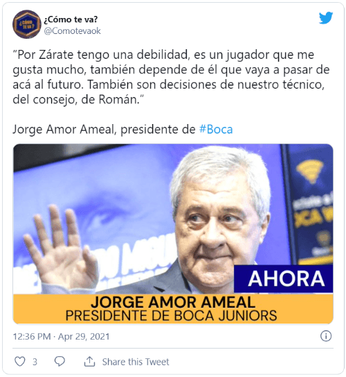 “Tengo una debilidad por Mauro Zárate,es un jugador que me gusta mucho. Depende de él lo que vaya a pasar en el futuro. También son decisiones de nuestro técnico, del Consejo, de Román (Riquelme)”, reveló el presidente del club de la Ribera.