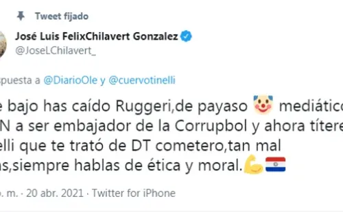 “Qué bajo has caído, Ruggeri. De payaso mediático en ESPN a ser embajador de la Corrupbol y ahora títere de Tinelli, que te trató de DT cometero. Tan mal estás, siempre hablas de ética y moral”, le escribió en Twitter el exarquero.