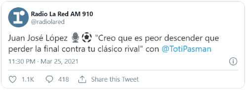 Ayer, en diálogo con Radio La Red, quien respondió la pregunta fue nada más ni nada menos que Juan José López, el entrenador que precisamente descendió con River en 2011 a la Primera B Nacional (hoy llamada Primera Nacional). Sin dar muchas vueltas, Jota Jota eligió una de las dos opciones.