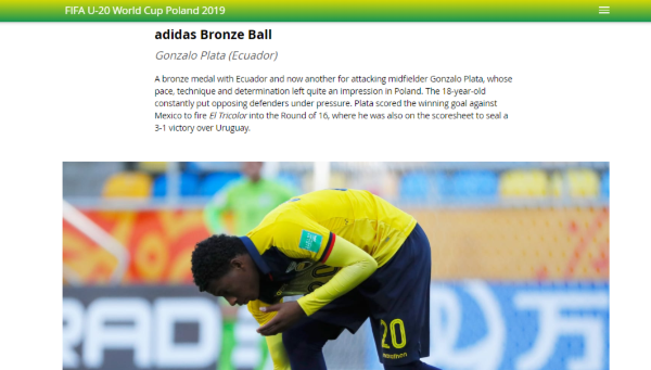 Según FIFA, el ecuatoriano mostró en el Mundial de Polonia“ritmo, técnica y determinación”, cualidades que lo hicieron acreedor del galardón.