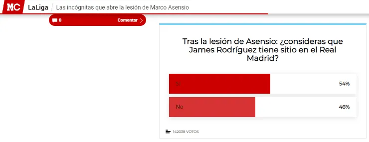 Por su parte, Marca publicó una encuesta con una consigna más que clara: “Tras la lesión de Asensio, ¿consideras que James Rodríguez tiene sitio en el Real Madrid?”.