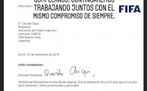 Expresando su gratitud, el dirigente argentino redactó: “Gracias presidente Gianni Infantino por tomarse personalmente unos minutos para redactar y enviar esta carta saludándome por mi cumpleaños”.