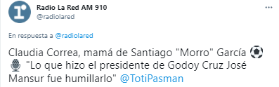 En diálogo conRadio La Red,Claudia Correa, madre del futbolista en cuestión, no dudó en volver a apuntar contra José Mansur, presidente de Godoy Cruz. Rememorando el maltrato que Santiago recibió por parte del máximo mandatario del Tomba, la mamá del jugador uruguayo manifestó: “Lo que hizo José Mansur fue humillarlo”.