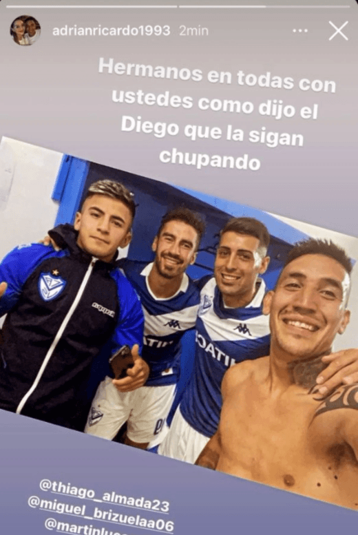 Posando junto a Thiago Almada, Miguel Brizuela y Martín Lucero, escribió: “Hermanos en todas con ustedes. Como dijo el Diego que la sigan chupando”.