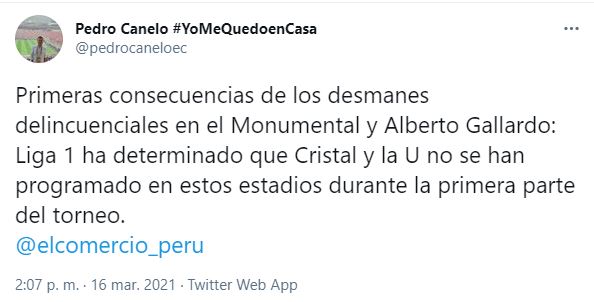 El periodista de El Comercio, Pedro Canelo indicó que la Liga 1 no programará a Universitario y Sporting Cristal en el estadio Alberto Gallardo y Estadio Monumental respectivamente.