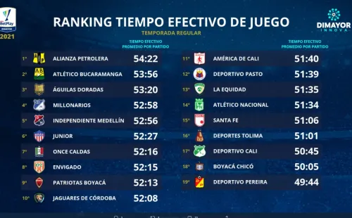 Los clubescon lo que menos tiempo de juego en cada jornada son con Deportivo Pereira, Boyacá Chicó, Deportivo Cali, Deportes Tolima e Independiente Santa Fe, estos últimos tres mejores clasificados en la tabla de posiciones.