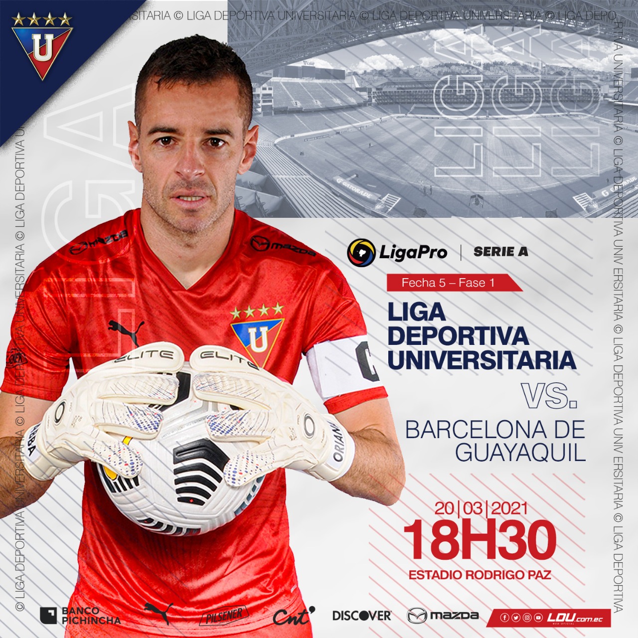 Liga de Quito vs. Barcelona SC se enfrentarán este sábado 20 de marzo por la quinta jornada de la Liga Pro de Ecuador. El encuentro se llevará a cabo en el Estadio Rodrigo Paza partir de las 18:30 horas locales y se podrá ver EN VIVO y EN DIRECTO a través de GolTV y GolTV Play.