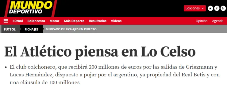 Según detalló Mundo Deportivo, luego de un trabajo correcto llevado a cabo, el Atlético Madrid habría posicionado su atenta mirada sobre Giovani y estaría dispuesto incluso a realizar una mega-oferta por el volante (las partidas de Griezmann y Lucas Hernández le darán una gran inyección económica al elenco de Sevilla).
