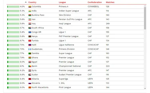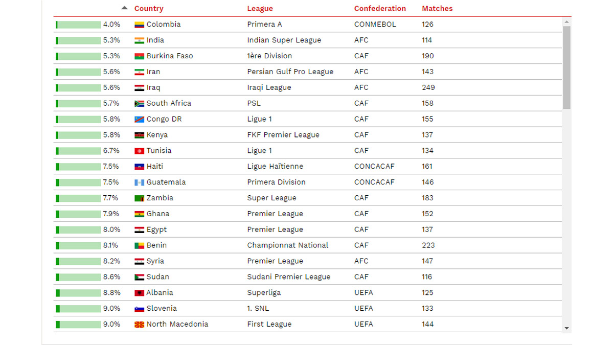 Luego de realizar tal comparación, la liga colombiana fue la que arrojo el menor porcentaje posible de desigualdad de partidos con un 4%. De las grandes ligas del fútbol mundial, la única que se asoma en los primeros lugares es la de España con un porcentaje de desigualdad del 11.4%. LaLiga quedó ubicada en la casilla 29.