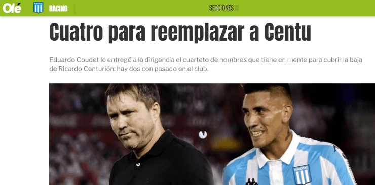 Según informó Olé, ya posicionado en pensando en lo que será la próxima temporada (sin Centurión), Coudet le habría entregado una lista a los directivos con cuatro nombres de jugadores que podrían reemplazar y suplantar la ausencia de Ricardo en el campo de juego.