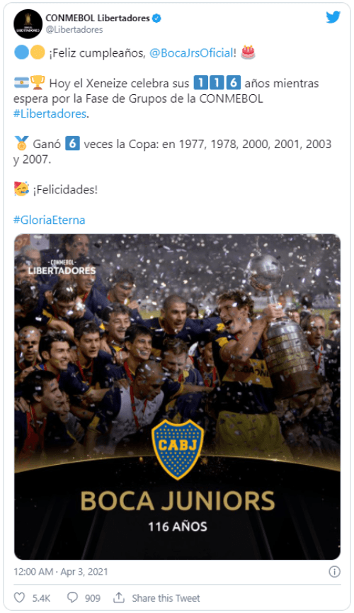 En este caso, la cuenta oficial de la CONMEBOL Libertadores aprovechó para saludar al club de la Ribera, que hoy está cumpliendo 116 años de historia. “¡Feliz cumpleaños Boca Juniors!”, escribió la entidad madre del fútbol sudamericano en un tuit, agregando la cantidad de veces que se alzó con el trofeo.