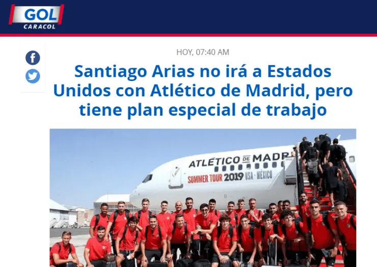 Luego de una ardua Copa América, Atlético Madrid tomó la decisión de no llevar a Santiago Arias a realizar la parte más ardua de la pretemporada.