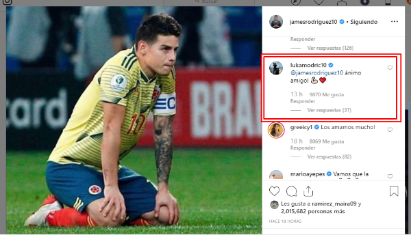 Cerca de 40 mil comentarios recibió la última imagen de James Rodríguez en su Instagram donde se lamentaba por la eliminación de Colombia de la Copa América. Uno de los más destacados lo hizo el actual mejor jugador del mundo, Luka Modric.