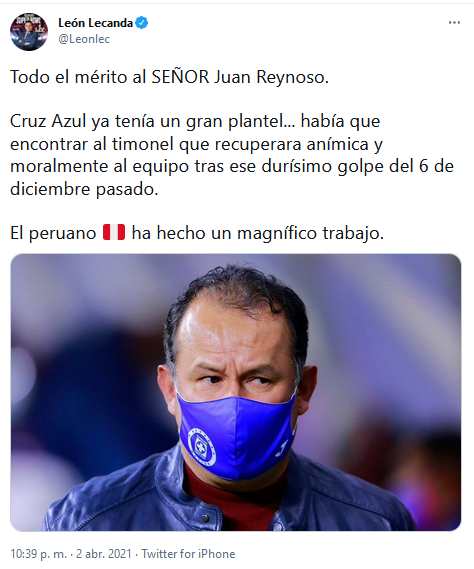 “Todo el mérito al SEÑOR Juan Reynoso. Cruz Azul ya tenía un gran plantel… había que encontrar al timonel que recuperara anímica y moralmente al equipo tras ese durísimo golpe del 6 de diciembre pasado. El peruano ha hecho un magnífico trabajo”, escribió el mencionado comunicador de ESPN.