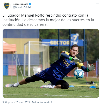 Horas más tarde de instalarse el rumor, através de su cuenta oficial de Twitter,la institución comandadatécnicamente por Miguel Ángel Russo oficializó la noticia en cuestión. “El jugador Manuel Roffo rescindió contrato con la institución. Le deseamos la mejor de las suertes en la continuidad de su carrera“, informó.
