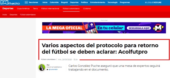 Ante este tema, Carlos González Puche, director de Acolfutpro entregó declaraciones a RCN Radio en las cuales admitió que existen muchas dudas con respecto al proceso a seguir en el protocoloy añadióque creó una mesa para poder atender los cuestionamientos que tienen varios sectores.“El documento que se envió a los ministerios de Salud, Deporte y Trabajo recoge lasobservaciones de la mesa de expertos médicosque ha constituido la asociación para verificar y buscar las mejores alternativas para prevenir el contagio de sus afiliados”.