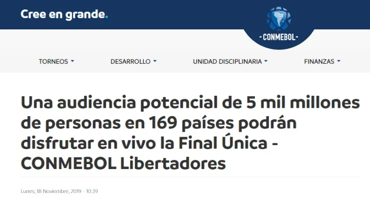 “El encuentro del próximo sábado 23 de noviembre en el estadio Monumental de Lima podrá ser seguido en vivo por una audiencia potencial de 5 mil millonesde personas en todo el mundo. De esta manera, un total de 169 países de los cinco continentes podrán disfrutar del partido que nombrará al nuevo campeón continental“, lee el artículo que está en el sitio oficial de la Confederación Sudamericana.