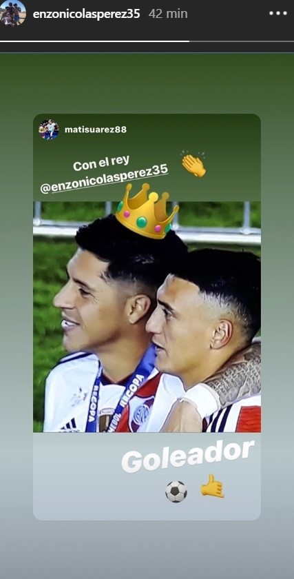Fue Matías Suárez el que subió una historia en sus redes sociales, con una foto junto a Enzo Pérez, abrazados y sonriendo.