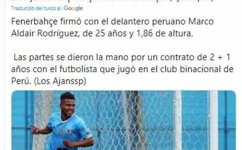 Y es que según un medio como Süper Lig, con más de 250 mil seguidores, “Fenerbahçe firmó con el delantero peruano Marco Aldair Rodríguez, de 25 años y 1,86 de altura”. “Las partes se dieron la mano por un contrato de 2 + 1 años con el futbolista que jugó en el club binacional de Perú”, continuan.