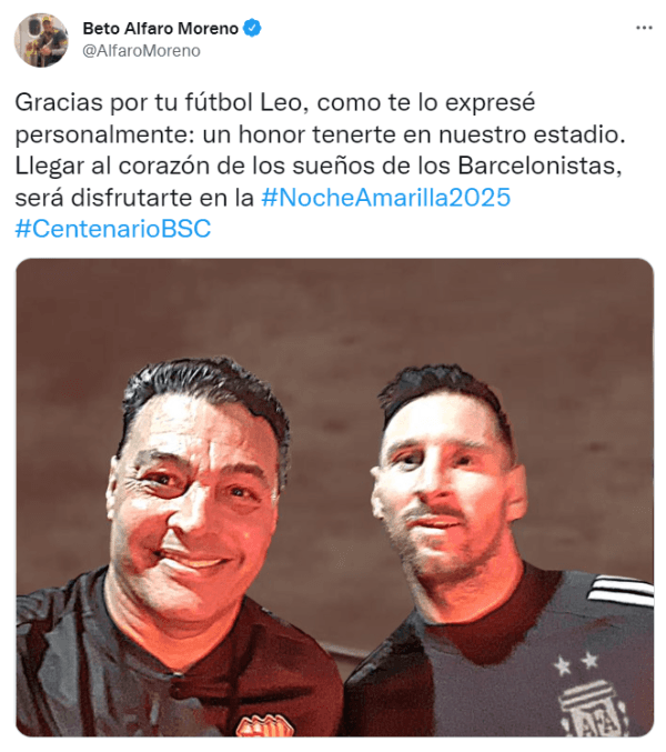 “Gracias por tu fútbol Leo, como te lo expresé personalmente: un honor tenerte en nuestro estadio. Llegar al corazón de los sueños de los Barcelonistas, será disfrutarte en la Noche Amarilla 2025“, escribió Alfaro Moreno junto a la fotografía de Messi.