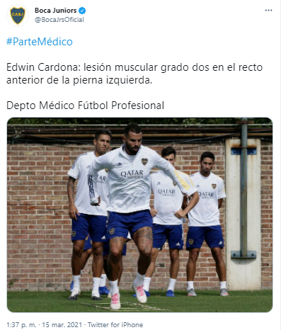 Confirmándose que Cardona sufrió una “lesión muscular de grado dos en el recto anterior de la pierna izquierda“, el Xeneize quedó a la espera y disposición del Departamento Médico. En las últimas horas, en relación al presente de Edwin, las novedades indicaron que el oriundo de Colombia también se perderá el duelo contra Independiente.