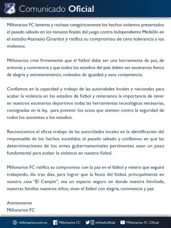 En el texto se puede resaltar que el equipo azul dice rechazar lo sucedido: ”Millonarios rechaza categóricamente los hechos violentos presentados el pasado sábado en los minutos finales del juego ante el Independiente Medellín en el estadio Atanasio Girardot y ratifica su cero tolerancia a los violentos”.