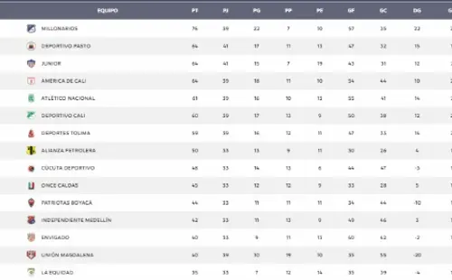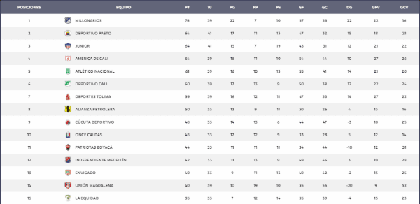 En esta tabla el primero es Millonarios con un total de 76 puntos, su más cercanos perseguidores son el Deportivo Pasto y América de Cali con 64, cabe recordar que el Junior no participa por ya estar clasificado.
