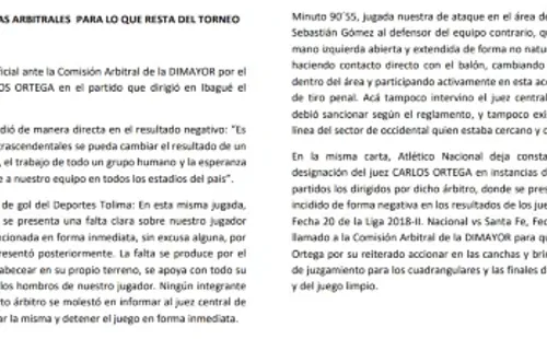 Así lo hizo conocer por medio de un comunicado, en el que expresó a la Dimayor su descontento porque según ellos el árbitro Carlos Ortega los afectó, dejando de pitar una falta previa ante el jugador Juan David Cabal al minuto 26 del partido, que terminaría con el gol del Tolima de Alex Castro con el que conseguiría la victoria.