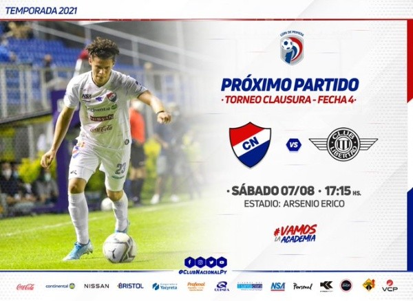 Por una nueva fecha de laCopa de Primera Tigo, Nacionalrecibe a su similar deLibertaden un cruce que se llevará a cabo este sábado 7de agosto.Las emociones de este encuentro serán transmitidasEN VIVO Y EN DIRECTOa través de la señal deTIGO SPORTS.
