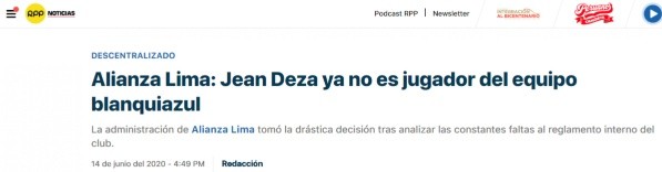 “Alianza Lima despidió a Jean Deza y ya no es más jugador del club”, señaló por ejemplo Fernanda Huapaya. La noticia, igual, fue confirmada en distintos medios. La principal fuente fue RPP que tituló: “Jean Deza ya no es jugador del equipo blanquiazul”.