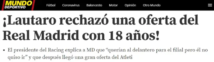 Por si faltaba algo para que el delantero argentino convenza al club azulgrana,Víctor Blanco, presidente de Racing, contó en una entrevista con Mundo Deportivosobre el día que el atacante rechazó ¡alReal Madrid! Sí, la Casa Blanca fue el primero en fijarse en él, cuando apenas estaba en inferiores y no había debutado como profesional en laAcademia. Dos años después, el club argentino lo vendió por más de 22 millones de euros al Inter.