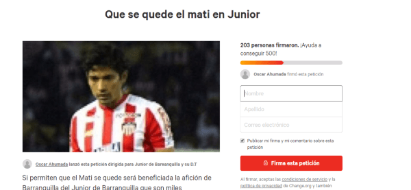 Un usuario, identificado como Óscar Ahumada, creo una petición en la página Change.org para recolectar firmas pidiendo que Matías Fernández se quede en Junior. Más de 200 personas se han unido a su causa.
