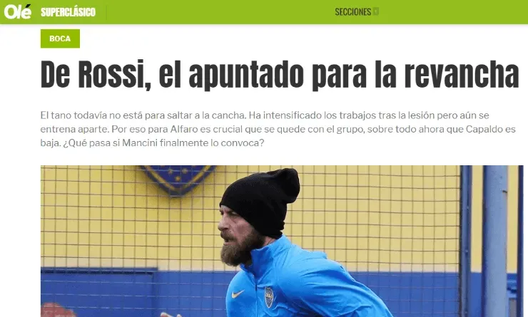 Aunque ni siquiera fue parte del banco de suplentes del plantel que se presentó en el estadio de la Banda el pasado martes, Daniele De Rossi tendría muchas chances de aparecer desde el inicio en la revancha próxima a disputarse.
