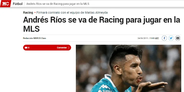 Si bien por el momento no hay nada oficial, el portal en cuestión señaló que Ríos irá a losSan José Earthquakesde la MLS por expreso pedido de Matías Almeyda, director técnico de la instiución.