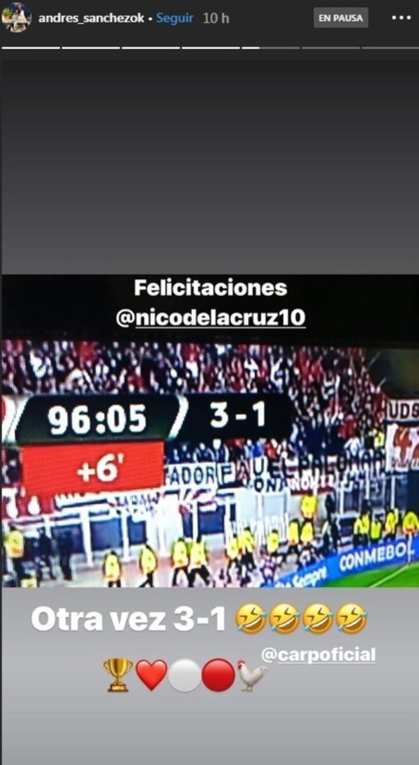 En ese contexto, Sánchez festejó a lo grande un nuevo título de River. Y lo demostró subiendo una historia a su cuenta oficial de Instagram. Eso sí: en la misma también hubo una burla para Boca.