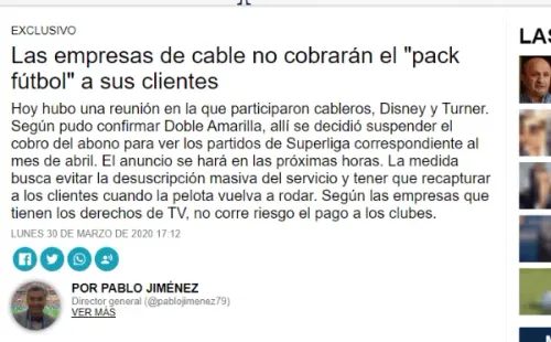 La decisión es que no se cobrará durante abril el pack y, en caso de que se haya hecho, se devolverá en la cuenta. Después, se verá que pasa en mayo, si es que vuelve el fútbol.