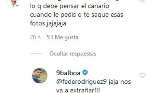 Y es que en esa nuva foto de Rocky, Fede comentó: “Ni me imagino lo que debe pensar el Canario cuando le pedis que te saque esas fotos”. “Jaja nos va a extrañar!!!”, le respondió Balboa.