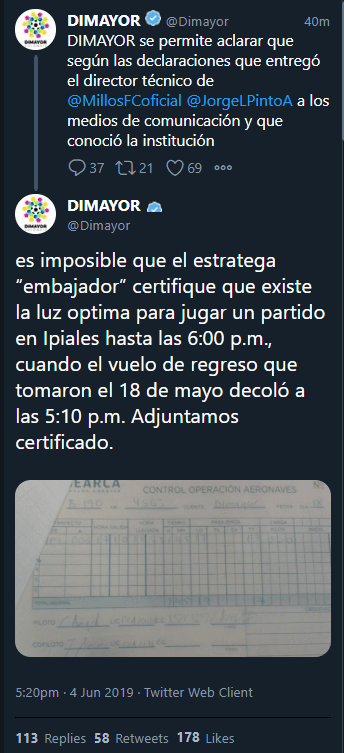 Dimayor quiso salir al paso de las declaraciones de Pinto y con documentos en mano le refutó que no era posible que supiera que había luz en el estadio de Ipiales, cuando Millonarios había regresado el mismo día a las 6 de la tarde. Eso es cierto, pero en el partido que jugaron en los cuadrangulares, hace unos días, no al juego al que hizo referencia Pinto.