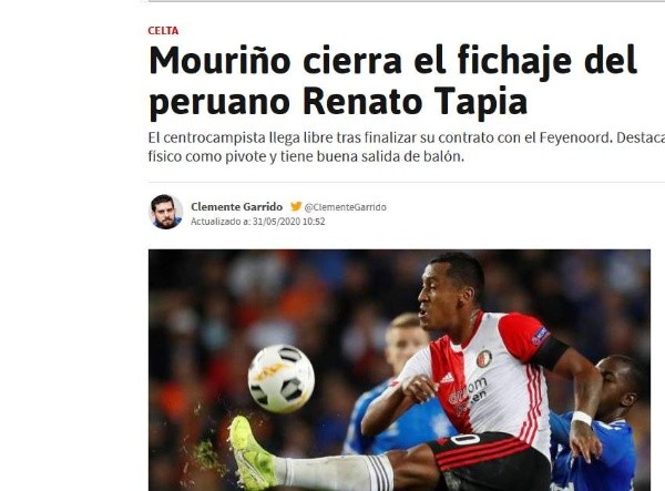 “Presidente del Celta de Vigo, Carlos Mouriño, cierra el fichaje de RENATO TAPIA. Nuestro seleccionado seguirá su carrera en Europa. Llegará en calidad de jugador libre ya que su contrato en Holanda vence el 30 de Junio”, señaló por ejemplo Edward Alva de GolPerú.