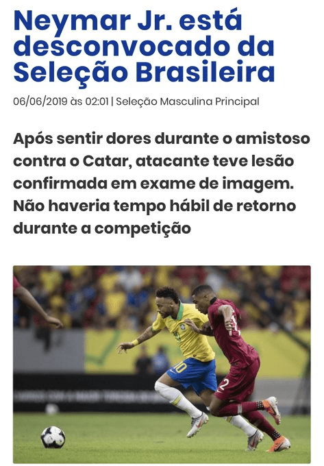Finalmente, comunicado por la federación de fútbol de Brasil, Ney sufrió un esguince en su tobillo.