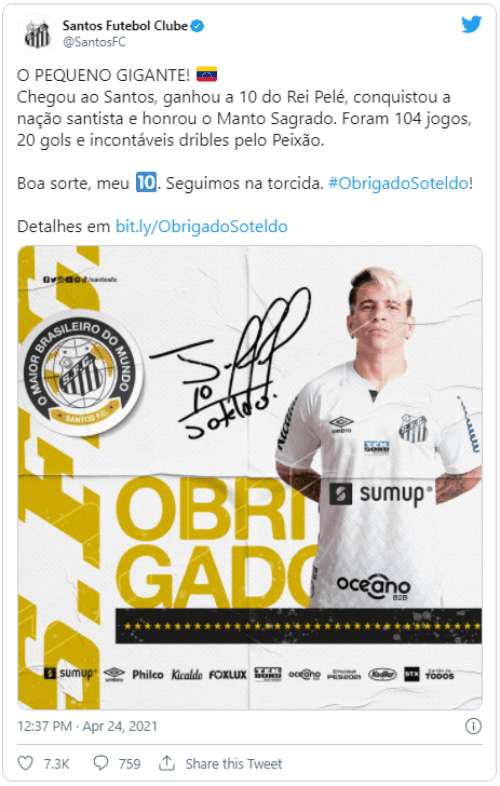 El venezolano no solo fue uno de los mejores jugadores de Santos en toda la Copa Libertadores, sino que fue el autor de uno de los tres goles que le propagó su equipo a Boca en Brasil. Pituca había abierto la cuenta en el primer tiempo, mientras que Soteldo había anotado el segundo a los 4′ del complemento.