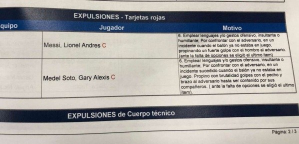 En el mismo, anuncia por qué al del Barcelona le sacó la tarjeta roja: “Por emplear lenguajes y/o gestos ofensivos, insultanes o humillantes; Por confrontar con el adversario, en un incidente cuando el balón ya no estaba en juego, propinando un fuerte golpe con el hombro”, dice el papel.