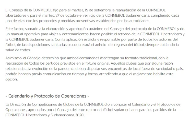 “El Consejo de la CONMEBOL fijó para el martes, 15 de setiembre la reanudación de la CONMEBOL Libertadores y para el martes, 27 de octubre el reinicio de la CONMEBOL Sudamericana, cumpliendo cada una de ellas con los protocolos y medidas preventivas establecidas por las autoridades“, dice el comunicado.