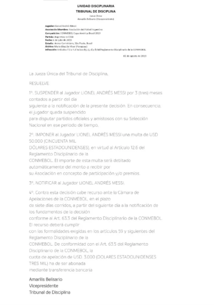 La Jueza Única del Tribunal de Disciplina, RESUELVE 1º. SUSPENDER al Jugador LIONEL ANDRÉS MESSI por 3 (tres) meses contados a partir del día siguiente a la notificación de la presente decisión.En consecuencia, el jugador queda suspendido para disputar partidos oficiales y amistosos con su Selección Nacional en ese periodo de tiempo.