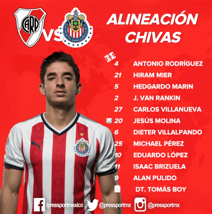 River y el Guadalajara se enfrentarán en el amistoso en elCounty Credit Union Stadium de San Diego, Estados Unidos, y ya confirmaron las alineaciones, con varias bajas por los convocados a la Copa América y a la Copa Oro respectivamente.