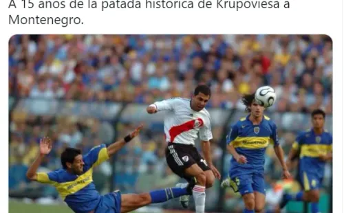 La imagen que más se recuerda a quince años de ese partido es la patada voladora de Juan Krupoviesacontra Daniel Montenegro de la que todavía no tomamos dimensión y de la que le dieron solamente dos jornadas al defensor delXeneize. Tal fue esa imagen que hoy en las redes sociales fue tendencia.