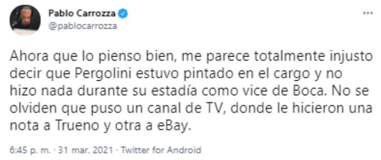 Arremetiendo contra el ahora ex directivo de Boca, Carrozza, sin pelos en la lengua, utilizó su cuenta de Twitter y escribió: “Ahora que lo pienso bien, me parece totalmente injusto decir que Pergolini estuvo pintado en el cargo y no hizo nada durante su estadía como vice de Boca. No se olviden que puso un canal de TV, donde le hicieron una nota a Trueno y otra a eBay”.