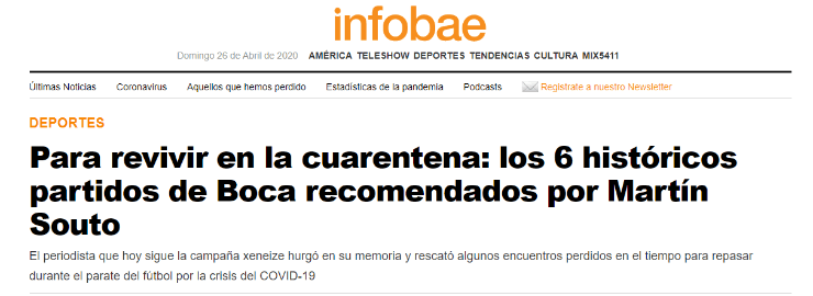 En esta oportunidad, Martín Souto, confieso hincha de Boca desde hace un tiempo, dialogó con Infobae y exteriorizó sus seis partidos legendarios del conjunto de La Ribera que no pueden faltar en las televisiones de los fanáticos del club para pasar la cuarentena.