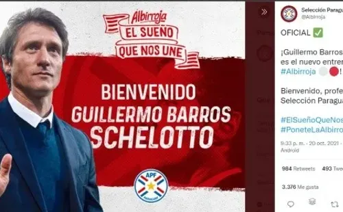 Por medio de un anuncio en redes sociales la Asociación Paraguaya de Fútbol anunció a Guillermo Barros Schelotto como nuevo seleccionador nacional. El mellizo tomará el cargo luego de que su compatriota, Berizzo, le dijera adiós al cuadro albirrojo el pasado 14 de octubre de 2021.