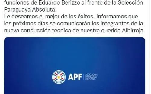 “La APF comunica que se dan por terminadas las funciones de Eduardo Berizzo al frente de la Selección Paraguaya Absoluta. Le deseamos el mejor de los éxitos.